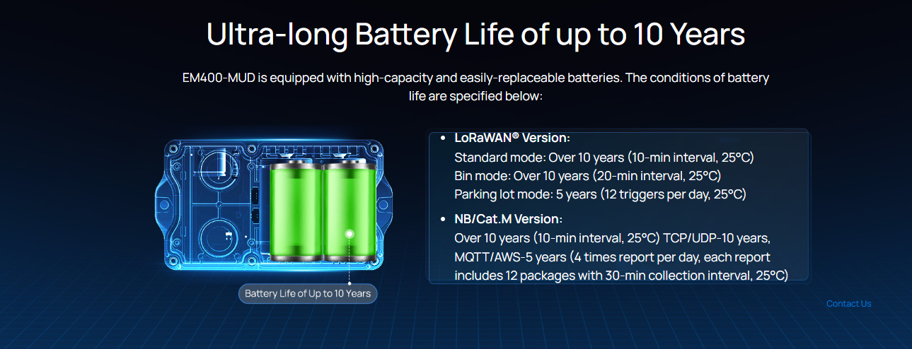 EM400-MUD არის მრავალმხრივი მოწყობილობა EM400 სერიებს შორის, რომელიც აღჭურვილია მრავალი გამოყენების რეჟიმით, რომლებიც ემსახურება სხვადასხვა სცენარებს, როგორიცაა ჭკვიანი ნარჩენების მართვა, ჭკვიანი პარკინგი და სხვა მანძილის/დონის გაზომვის აპლიკაციები. EM400-MUD წარმოადგენს ძლიერ გადაწყვეტას თავისი სხვადასხვა რეჟიმით, გახანგრძლივებული ბატარეის ხანგრძლივობით და მყარი კონსტრუქციით, რაც უზრუნველყოფს ეკონომიურ და საიმედო ვარიანტს ეფექტურობის გასაზრდელად.