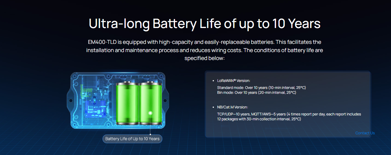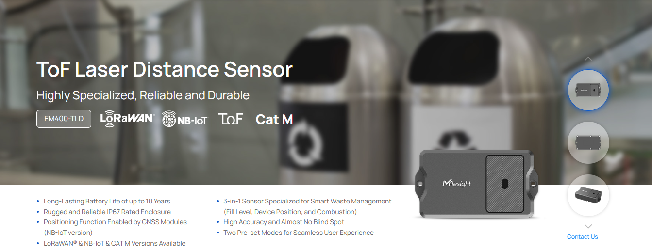 EM400-TLD EM400 სერიის მაღალ სპეციალიზებული პროდუქტია, რომელიც შექმნილია პატარა და მინი ნაგვის ურნებისთვის და გამოირჩევა ძლიერი ფუნქციების ფართო სპექტრით, მათ შორის გადავსებული ნაგვის აღმოჩენის, ნაგვის ურნის სახურავის სტატუსის და ნაგვის წვის უნარით. წინასწარ დაყენებული რეჟიმებით, რომლებიც მომხმარებლებს კონფიგურაციისგან ათავისუფლებს, EM400-TLD იდეალური გადაწყვეტაა ჭკვიანი ნარჩენების მართვისთვის, რაც უზრუნველყოფს ხანგრძლივ მუშაობას, რომელზეც მომხმარებლებს შეუძლიათ დაეყრდნონ. გარდა ამისა, მისი ხელმისაწვდომობა როგორც LoRaWAN®-ის, ასევე NB-loT ვერსიებში საშუალებას იძლევა სხვადასხვა სცენარის გამოყენებისთვის.