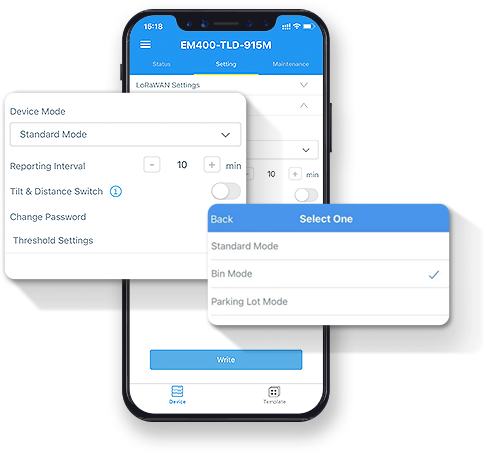 EM400-TLD აღჭურვილია ორი წინასწარ დაყენებული რეჟიმით, კერძოდ, სტანდარტული რეჟიმით და ურნის რეჟიმით, რომელთაგან თითოეული შექმნილია მანძილის გაზომვისა და ნარჩენების ურნების მონიტორინგის აპლიკაციების საერთო მოთხოვნების დასაკმაყოფილებლად. ეს რეჟიმები კონფიგურირებულია მონაცემთა შეგროვებისა და ანგარიშგების სხვადასხვა ინტერვალებით, ოპტიმალური მუშაობის უზრუნველსაყოფად. ამ მზა რეჟიმების ხელმისაწვდომობის წყალობით, მომხმარებლებს შეუძლიათ EM400-TLD სწრაფად ინტეგრირება მონიტორინგის გადაწყვეტილებებში.