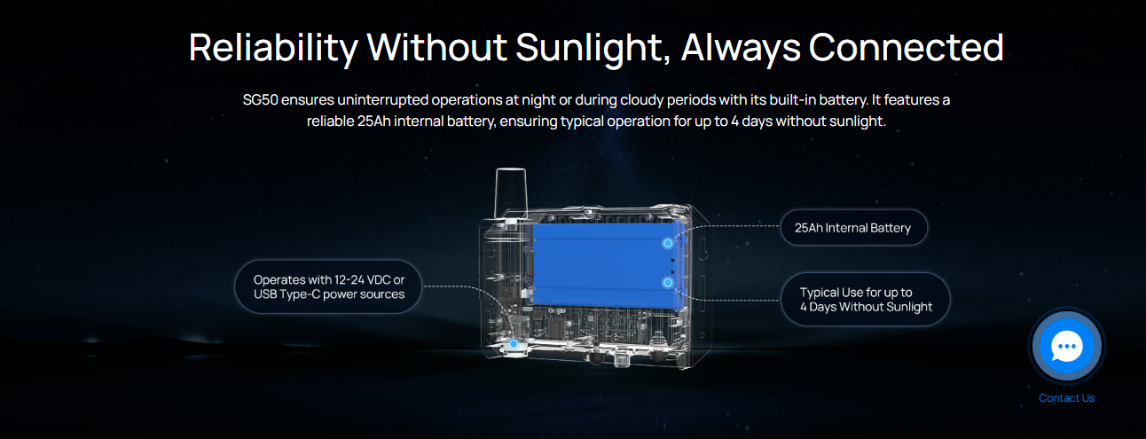 SG50 იყენებს 30 ვატიან სტანდარტულ მზის პანელს (სურვილისამებრ 45 ვატიანი განახლებით) მზის ენერგიის მისაღებად, ერთდროულად აწვდის მოწყობილობას ენერგიას და ტენის შიდა აკუმულატორს მზის სხივების უხვი შუქის პირობებში. ის დინამიურად არეგულირებს დამუხტვის დენს აკუმულატორის ტემპერატურის მიხედვით, რათა ოპტიმიზაცია გაუკეთოს მზის ენერგიის გამოყენებას და გაზარდოს აკუმულატორის მუშაობის ხანგრძლივობა.